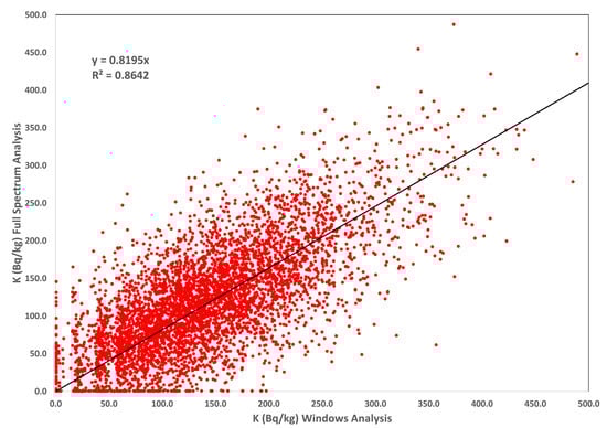 The concentrations of potassium, uranium, and thorium for the two methods were also plotted against one another and the coefficients of determination of 0.86, 0.24, and 0.34 were found for the different nuclides, respectively. A plot of the potassium concentrations for the two methods is illustrated in Figure 9. It is evident from the coefficient of determination that the potassium concentrations compare relatively well, contrary to the uranium and thorium concentrations. This may be due to relatively high concentrations of potassium and relatively low concentrations of uranium and thorium in aquatic sediment. The lower concentrations are more prone to statistical variation, which favors the full spectrum method were more counts are integrated compared to the energy windows methods.