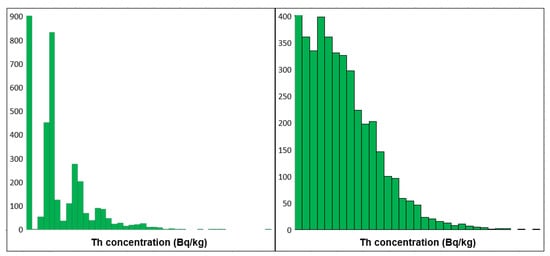 Frequency diagrams of thorium concentrations that were extracted using the energy windows method (left) and the full spectrum method (right).