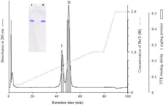 TTX-binding protein was isolated using five purification steps. In the first step of salting out, TTX-binding protein was recovered from the 30 to 50% saturation ammonium sulfate fraction. The TTX-binding protein was subjected to lectin affinity chromatography on a Con A-Sepharose column and eluted in the methyl-α-D-mannopyranoside eluate fraction (data not shown). Next, the active fraction containing the TTX-binding protein was chromatographed by anion-exchange HPLC on a MonoQ 5/50 GL column and eluted with 0.6–0.8 M NaCl in 0.01 M sodium phosphate buffer (pH 7.4) (data not shown). Finally, the TTX-binding protein was re-chromatographed using a MonoQ 5/50 HPLC after preparative electrophoresis. TTX-binding protein was detected at retention times of 44–46 min (Fraction I) and 48–52 min (Fraction II) (Figure 1). Native PAGE analysis revealed that both fractions produced only one band, confirming their homogeneity (Figure 1). Fraction I showed the TTX-binding activity of 0.22 µg TTX/mg protein and Fraction II of 0.33 µg TTX/mg protein. Because Fraction II had higher TTX-binding activity and more TTX-binding protein than Fraction I, Fraction II was identified as H. sanguineus TTX-binding protein (HSTBP) and used in further experiments.