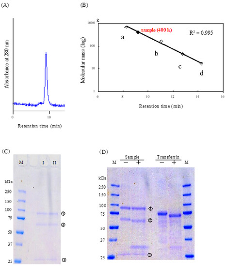 Molecular mass of TTX-binding protein: (A) gel filtration HPLC on a TSKgel G3000SWXL column (0.78 × 30 cm); (B) calibration curve for the determination of TTX-binding proteins by gel filtration HPLC; ●: TTX-binding protein, ◇: standard proteins, a: thyroglobulin (670 kDa), b: bovine γ-globulin (158 kDa), c: chicken ovalbumin (44 kDa), d: equine myoglobin (17 kDa); (C) SDS-PAGE. I; peak I obtained from MonoQ anion-exchange HPLC, II; peak II obtained from MonoQ anion-exchange HPLC; ①, ②, and ③ indicate subunits-1, -2, and -3, respectively; (D) SDS-PAGE before (−) and after (+) deglycosylation treatment with PNGase F; ①, ②, and ③ indicate subunits-1, -2, and -3, respectively. Transferrin was used as a control of N-glycosylated protein.
