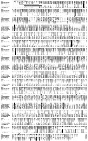 Deduced amino acid sequence alignment of TTX binding protein, HSTBP, with clotting proteins of shrimp and crab from the suborder Pleocyemata. Accession numbers for clotting proteins (DDBJ/EMBL/GenBank databases): XP_045118682.1 for Portunus trituberculatus; AYK27566.1 for Scylla paramamosain; KAG7156252.1 for Hormarus americanus; AAD16454.1 for Pacifastacus leniusculus; AYD41596.1 for Procambarus clarkii. The residues identical with those of HSTBP are shown by gray and gaps by dashes. Signal peptides are boxed in straight lines. Cysteine residues are highlighted in white on a black background. Putative N-glycosylation sites are indicated by closed circles. Amino acid numbers are shown at the left and right.