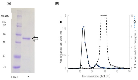 Recombinant protein of TTX-binding protein subunit-2, rHSTBP sub-2: (A) SDS-PAGE, lane 1: marker; lane 2: sample; white arrow indicates recombinant protein of TTX-binding protein subunit-2, rHSTBP sub-2; (B) Sephacryl S-300 column chromatography; Sample: recombinant protein of TTX-binding protein subunit-2, rHSTBP sub-2, mixed with TTX; column: Sephacryl S-300 (2 × 29 cm); mobile phase: 0.02 M Tris-acetic acid (⇒Change to ”acetate”) buffer (pH 7.4); flow rate: 0.5 mL/min. Fraction: 4 mL/Fr.