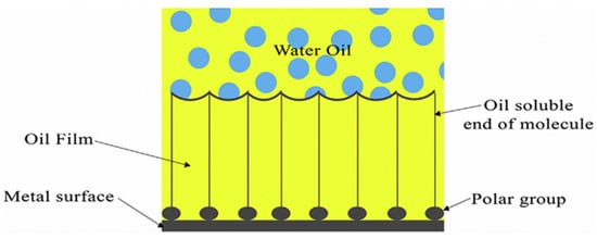 When microorganisms gather on the metal surface, the oxygen concentration on the metal surface decreases after the biofilm is covered, which plays the role of an anode. The covering part without the biofilm will show a higher oxygen concentration, which plays the role of a cathode. At this time, microorganisms promote the corrosion of metals [41]. Microbiologically influenced corrosion (MIC) is widely considered as an important reason for the release of dangerous hydrocarbons, which may lead to fire and explosion and have a significant impact on the economy and environment [42,43]. Yazdi et al. [44] used a continuous Bayesian network (CBN) and other technologies to monitor and manage MIC. The film formed by the corrosion inhibitor is shown in Figure 4. The lower part of the sandwich is the connection between the polar head of the molecule and the metal surface, and the protective function depends on the strength of this link. The middle part of the sandwich is the non-polar end of the molecules, and the degree of protection participation in the sector is dependent on the covering or wetting level of the surface by the molecules. The upper part of the protective sandwich is a hydrophobic layer of oil or hydrocarbon that is attached to the tails and the long carbon chain. This oil layer acts as an external protective film that, by covering the corrosion inhibitor film, acts as a barrier against the penetration of iron ions from the metal surface to the electrolyte, while also decreasing the diffusion to the internal parts and corrosive factors.