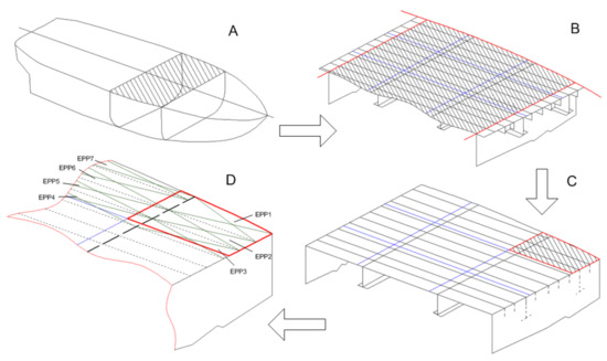 Sequence of steps for preparing data as applicable for elementary plate panel strength calculations. (A) selection of part of the structure; (B) consideration of the contour of structure boundaries and their strengthening topology; (C) determination of coordinates and calculation data for the of each plate; (D) determination of coordinates and calculation data for each EPP. Plate borders are shown in blue, in red—the borders of the selected plate or structure.