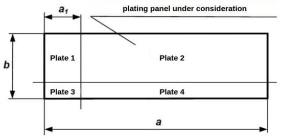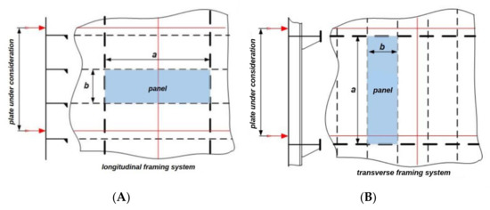 The requirements of the Rules of Classification Societies for platings’ local strength and buckling are formulated within the scope of a plate model. In terms of real structure, the plates correspond to panels of platings and framing beams. The supporting structure of the panels is formed using stiffening elements—primary supporting members, stiffeners, brackets or adjoining adjacent structures (decks, bulkheads, etc.). The Rules of Register of Shipping, Part II [1], uses the term “plate element” for such panels. The Rules of other Classification Societies and CSR documents use the term “elementary plate panel”, or EPP (see, for example, ref. [2]). The literal definition in [2] states that it is “an unsupported part of the plate located between the ordinary and/or primary supporting member”.