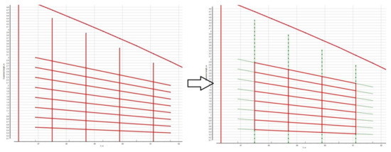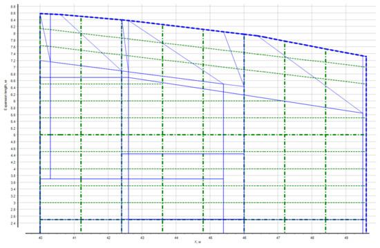 Initially, a set of segments limiting future EPPs (corresponding to stiffeners and primary supporting members) should be constructed. The ends of the members that do not have support are cut off (see Figure 9). Each segment corresponding to the stiffener route is written into the data array with a unique number as the following data set: coordinates of two end points—Pt1(x1,y1), Pt2(x2,y2) and a reference index pointing to a stiffener in the array.