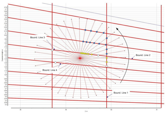 For each ray, a search is made for all found intersections with trace lines of beams of the set (see Figure 11) and the result is written to temporary arrays of intersection points and indices of beams with which the intersection was found—Pts[x,y]i and Indexes[], after which the distances from the Pt_base point to the Ptsi points are calculated, and the intersections located at the minimum distance from the base point are written to the intermediate results data array. In Figure 11, white dots denote the intersections of the search sections with the boundary lines first registered and defining the panel boundary; blue points denote the points that are most distant from the primary point, i.e., are not taken into account; yellow points denote the intersections of the section with the boundary line that are closest to the primary point, but that are repeated once with the already registered section in the loop and, therefore, they are not taken in account. For each intersection written to the array, the identifier of the line with which it has an intersection is stored. After verifying all the sections and storing all intersection identifiers into a single array, the loop is assembled for the panel, for which the intersection points of all lines bounding the panel are sequentially calculated. The intersection point set is the desired loop. The results of the panel searching are shown in Figure 12, Figure 13 and Figure 14.