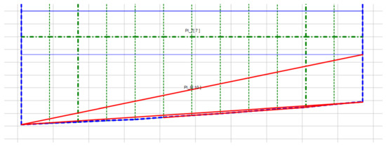 Incorrect formation of plate outlines due to the partial conjunction of two sides of clipping polygon (deck grillage outlines) and two sides of clipped polygon (deck plating outlines). In this Figure green thick dashed line—primary supporting members, thin dashed line—stiffeners, blue dotted line—deck grillage borders, solid blue—plate borders. The red thick line shows the invalid plate border.
