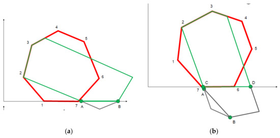 The clipping of elements protruding over the red polygon is carried out cyclically. The first action is joint transposition of polygons in the coordinate system in such a way that the side 1–7 lies on the horizontal coordinate axis. After that, a search is made for points of horizontal axis intersection with the side of “green” polygon (A and B points, Figure 19a). A gray color shows elements that are caught in the area below the horizontal axis. These elements are removed, and corresponding sides are reduced to A and B points.