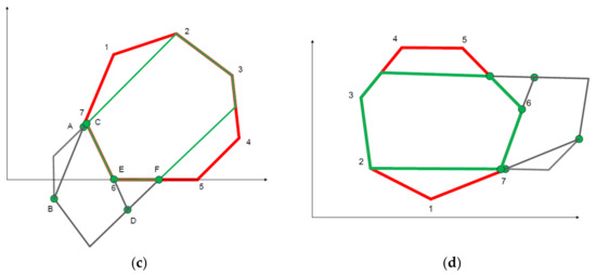 Further, the same actions are performed, only just with respect to 7–6 sides (Figure 19b), 6–5 sides (Figure 19c) and so on, until the polygon is rotated to the last side (1–2). After these actions are completed, the polygons are transposed to their initial positions in the coordinate system, but the “green” polygon is already in a transformed form (Figure 19d). An example of the operation of the described algorithm can be seen in Figure 20 (and can be compared with Figure 16).