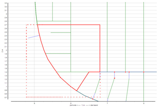 An example of forming the contour of a transverse bulkhead plate in the area of adjacency of the double-bottom plate; while the first polygon is the contour of the transverse bulkhead, the second is the quadrangle of the plate borders. In this Figure: green lines—stiffeners, primary supporting members and adjoining structures, blue lines—beams shown in section, red dotted line—user-specified plate boundaries, red thick line—the result of generating the plate contour.