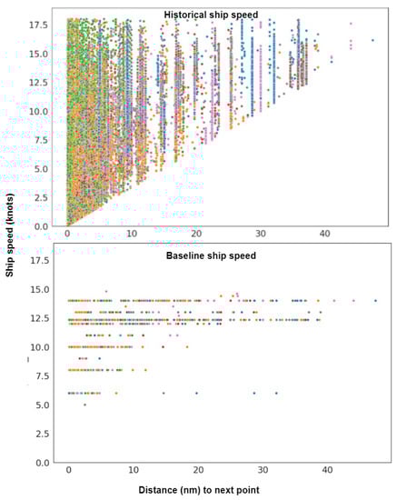 The VTS provide services to ships within a given zone to ensure efficient and safe navigation. The services can range from delivering simple information to ships about the traffic situation and weather conditions to managing and monitoring ship traffic [36]. In this study context, the VTS determines each ship’s optimal route expressed as a sequence of reference points that should be followed from the departure point to the destination point. The VTS has established fixed speed values between consecutive reference points. The speed values are, for instance, used to determine the travel time to destinations. The same value is used regardless of the vessel type, weather conditions, or route sequence, leading to inaccurate estimations. The difference between the baseline and the realized speeds of ships is depicted in Figure 1. The different colors indicate different ship types.