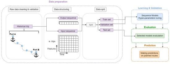 - Data preparation: This step consists of transforming raw data into a suitable form for modeling. This study considers three main preparation operations. The first operation’s objective is to improve the data quality by applying data cleaning and validation techniques. The second operation structures data into input and output sequences for each ship trip. The last operation splits the input and output sequences into training, validation, and test sets. The details of the different operations are provided in Section 3.2