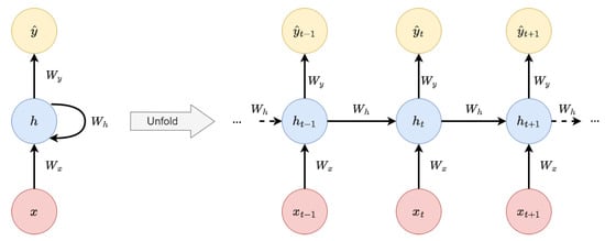 Recurrent Neural Networks (RNNs) are a class of deep learning designed for sequence data; they have been widely used, particularly for natural language text processing. At each step t of the sequence, the RNN performs the same function with the same parameters to predict the value using both the current input and the previous hidden state . This study considers a type of RNN producing an output at each step and having recurrent connections between hidden units, as illustrated by an unfolded representation in Figure 3. The RNN maps an input sequence to an output sequence of the same length. The forward propagation in the RNN is provided by the following Equations (1)–(3). The input to the hidden connections is parameterized by the weight matrix , the recurrent connections between hidden units by the weight matrix , and the hidden-output connections by the weight matrix . The bias vectors are and . The loss L measures the difference between the RNN’s output and the true target y of all the time steps.