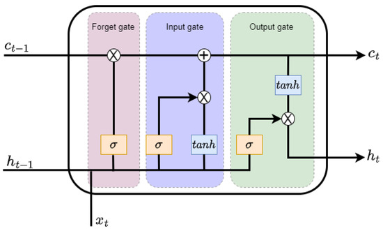 Learning long-term dependencies is a challenge in RNNs. The propagation of gradients over many stages tends to vanish or explode. Gated RNNs were created to overcome these problems, including the LSTM networks [37], which are better at learning long-term dependencies than normal RNNs. Cells in LSTM networks replace the hidden units of the ordinary RNNs and are connected recurrently to each other. In addition to the input and output of a normal RNN, LSTM networks also have other parameters and a system of gating units to control the information flow. The LSTM cell graph is depicted in Figure 4. LSTM networks use a forget gate (4), an input gate (5), and an output gate (6). A forward pass of an LSTM cell is expressed by the following equations: