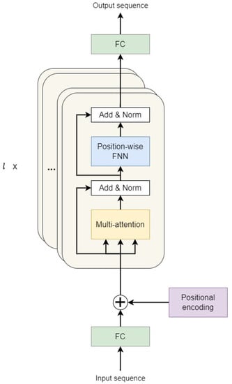 The encoder–decoder sequence-to-sequence architecture was proposed to enable an RNN to map an input sequence to an output sequence of different lengths. This architecture is based on an encoder RNN to process the input sequence and a decoder RNN to generate the output sequence. The attention mechanism for encoder–decoder models was first proposed by [39]. The mechanism focuses on particular elements of the input sequence to produce an output at each time step. Transformers [40] are an effective encoder–decoder model based on attention mechanisms without any convolutional or recurrent layers. Transformers have become popular thanks to their ability to handle long sequences using less memory and computational requirements than RNNs. Transformers were initially proposed for text data, but they have been effective in many applications, including vision and speech [41]. The transformer model depicted in Figure 5 has an encoder block preceded by an input layer and a positional encoding layer. The input layer is a fully connected feed-forward network that transforms the input sequence to have features per step. The transformed input sequence is added with positional encoding and fed into the encoder. The encoder block is a stack of l identical encoder layers, each with two sub-layers of multi-head self-attention and position-wise feed-forward networks. The single attention mechanism in the transformer (10) is based on computing the dot product of the query Q with all keys K, dividing by , and applying the function to obtain the weights on the values V: