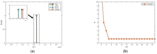 It can be seen from Figure 1a that all three algorithms, i.e., the ANM and RAM methods, and the VATDE proposed in this paper, could obtain better time delay estimation results in the case of a single time delay. Meanwhile, the enlarged window in Figure 1a further shows that the VATDE algorithm was closer to the real-time delay than the RAM and ANM algorithms. Therefore, the VATDE algorithm’s time delay estimation accuracy was higher, while the time delay estimation accuracy of the RAM algorithm was also slightly better than that of the ANM algorithm. Figure 1b shows the estimation of the number of time delays existing using the VATDE algorithm. However, since the ANM and RAM algorithms cannot provide an estimate of the number of time delays, the number of time delays can only be manually determined. It can be seen from Figure 1b that the VATDE algorithm provided an accurate estimation of the number of time delays with only a few simple iterations, which avoids the interference caused by false peaks when determining the true time delay estimation.