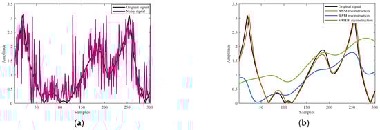 Signal reconstruction performance of different algorithms with an SNR of 10 dB. (a) Original signal phase and noise, (b) reconstruction results of signal phase by different algorithms.