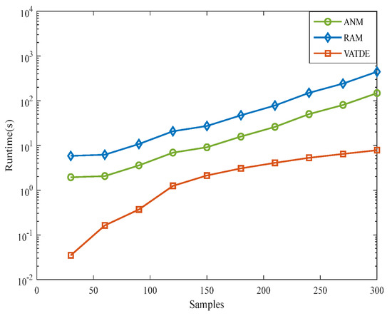 The average running times of the ANM, RAM, and VATDE algorithms in MATLAB 2020a are shown in Table 1. Compared with the ANM and RAM algorithms, VATDE clearly had the shortest running time. The running times of the ANM and RAM algorithms were much longer than that of the VATDE algorithm. The running time of the RAM algorithm was a multiple of the running time of the ANM algorithm, and the specific value depended on the number of iterations. In this paper, the number of iterations was set to three and it can be seen that RAM took three times as long as ANM to complete. The simulation results were consistent with the theory and prove the high computational efficiency of the VATDE algorithm.