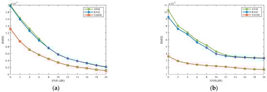 Meanwhile, the signal simulation remained unchanged. The settings of single time delay and multiple time delays were the same as those in the above simulation. When SNR changed from 0 dB to 20 dB, then the RMSE of the ANM, RAM, and VATDE algorithms was compared, and each result was obtained using 500 Monte Carlo simulations. The simulation results are shown in Figure 6. Figure 6a shows the RMSE and SNR curves under a single time delay, while Figure 6b shows the RMSE and SNR curves under multiple time delays. It can be seen that the RMSE of the VATDE algorithm was lower than that of the ANM and RAM algorithms in the cases of both single and multiple time delays. Especially in a low SNR environment, the time delay estimation accuracy of the ANM and RAM algorithms deteriorated significantly, while VATDE still had high time delay estimation accuracy. In addition, the RMSE of the ANM and RAM algorithms was approximately equal with a single time delay, but with multiple time delays, the RMSE of the RAM algorithm was lower than that of the ANM algorithm. This may be because the RAM algorithm had fewer false peaks than the ANM algorithm. Moreover, it can be seen from the RMSE results in Figure 6a,b that the RMSE curves of the ANM, RAM, and VATDE algorithms in Figure 6b were much more than three times those in Figure 6a, which may have been due to the mutual interference between multiple time delays, which reduced the accuracy of time delay estimation. If the post-processing method of the cross-correlation function is adopted, that is, only the peak region of the cross-correlation function is searched separately, avoiding the search of the whole continuous time region, then the accuracy of time delay estimation with multiple time delays may be further improved. This is the next step of this study, and will not be discussed here.
