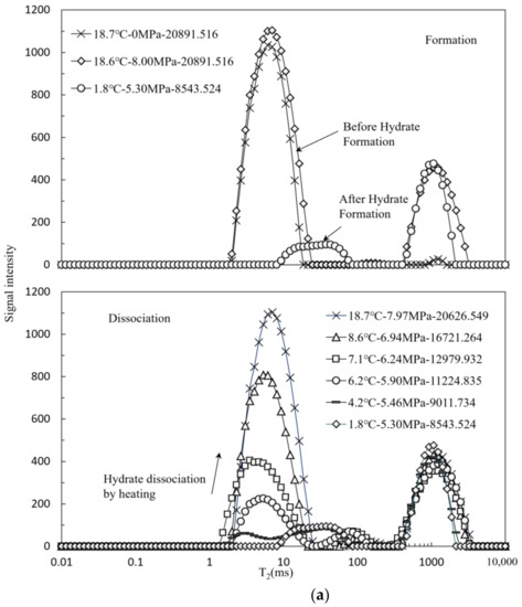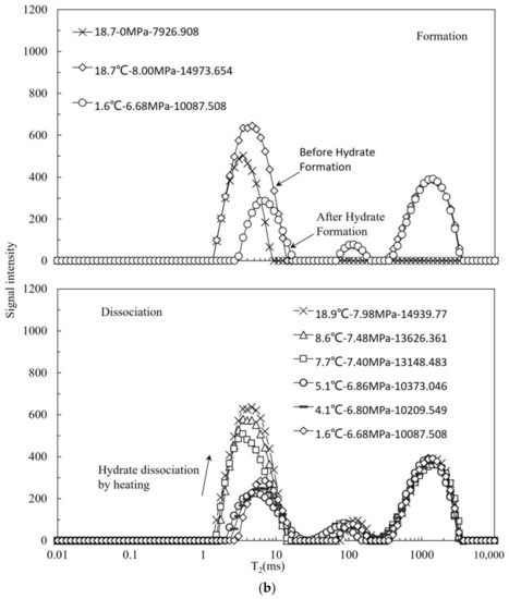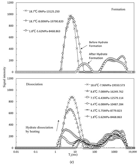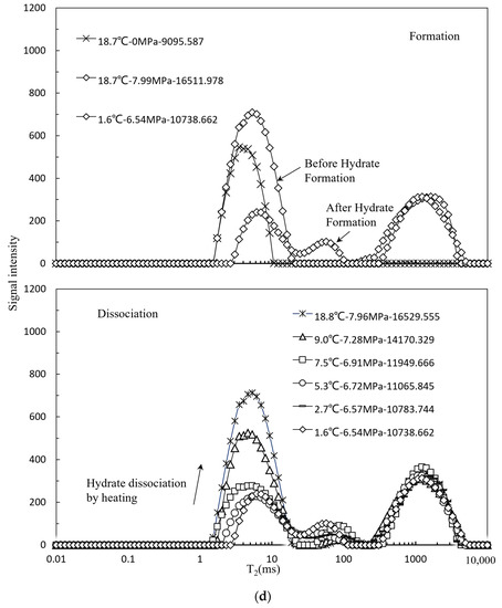 - Ji, Y.K.; Hou, J.; Cui, G.D.; Liu, Y.L.; Du, Q.G. Experimental study on methane hydrate formation in a partially saturated sandstone using low-field NMR technique. Fuel 2019, 25, 82–90. [Google Scholar] [CrossRef]