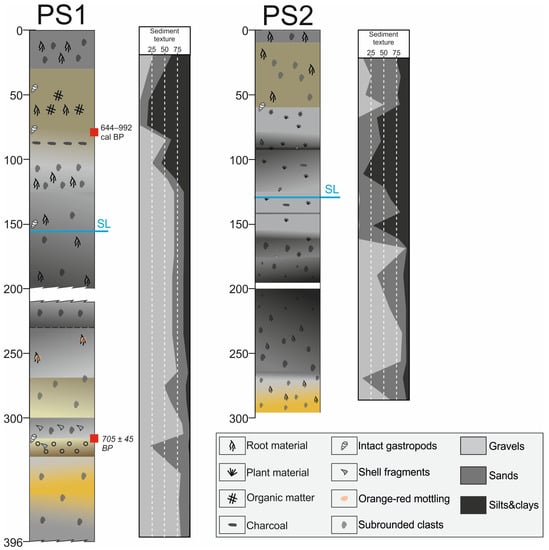 Core PS1 reached the depth of 3.96 m below the ground level (−2.4 m below sea level) (Figure 2). From 3.96 m to 3.3 m, the core is composed of pebbles mixed with coarse sand of a yellow color at the upper part and gray at the lower part. Gravels represent 80.1% of the total sediment texture, sands 18.5% and silts/clays 1.4%. From 3.3 m to 3.16 m, brown coarse sand is predominant with some broken gastropods. Sands represent 74.5% of the total sediment texture at the top part and gravels reach 22.2%. Between 3.16 m and 3 m, the core consists of pebbles and a few cobbles, most of which are angular. Gravels represent 85.3% of the total sediment texture, sands 13.6% and silts/clays 1.1%. Radiocarbon dating of a marine shell at 3.16 m provided an age of 705 ± 45 BP. This deeper sample yielded an age younger than the other, shallower sample (Table 1).