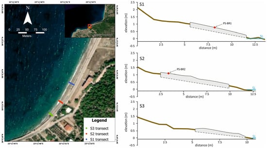 The spatial mapping of the beachrocks was accomplished using a differential global position system (DGPS) with global navigation satellite system (GNSS) system receiver (Spectra SP60). The detailed recording of the beachrocks included elevation/depth (with respect to the mean sea level), length, and width of the seaward and landward parts with an accuracy of 3 cm. Three transects (S1, S2 and S3) were accomplished, which also included sampling the front (seaward) and the end (landward) of the beachrock slabs [,,].
