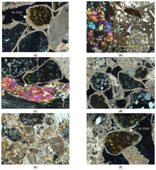Representative photomicrographs under crossed polars illustrating beachrock composition. The photomicrographs are taken from polished thin sections of beachrock samples where Mc: microcrystalline or micritic cement, HMC: high magnesium calcite cement, MC: magnesium calcite, Qz: quartz, prx: pyroxene. Microcrystalline cement with a light brown color is indicative of HMC coating. (a) Thick microcrystalline HMC cement coats lithoclasts and minerals in sample S1E, (b) micritic HMC cement is developed playing the role of pore filling in sample S1F, (c) thick microcrystalline HMC cement coats lithoclasts and minerals in sample S2E, while in (d), thick microcrystalline HMC cement binds grains while forming pore-filling forms in sample S2F. (e) Well-developed sparitic crystals of MC filling all beachrocks pores in sample S3E and (f) thick microcrystalline HMC cement coats lithoclasts while forming pellets and pore-filling forms in sample S3F.