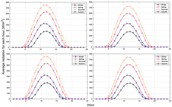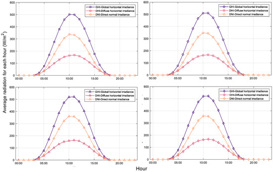 Because the production of sun-based energy is dependent on the availability of the sun, it is necessary to determine the hours when solar radiation is present. The average hourly global, diffuse, and direct radiation values calculated as a mean for all days in 2021 are illustrated in Figure 2. The peak value for all four locations is recorded around 11 o’clock. The only difference is given by site P1, which has the maximum at 10 o’clock, but the difference between the global radiation from 11 o’clock and that from 10 o’clock is only 1 . For these locations, no value for solar radiation was recorded in an 8 h interval.