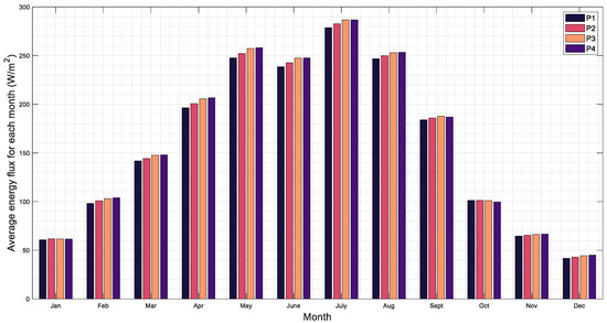 In Figure 3 and Figure 4, it can be seen that the summer months in this region receive a large quantity of solar radiation, with the month of July having the highest value of global solar radiation and the P3 site also having the highest value of approximately 287 , and the P1 site having the lowest value of 278 . December receives the least amount of solar radiation with just 41 registered for site P1. The difference between the most productive site and the least productive is 3.2% for the maximum radiation and 9% for the minimum.
