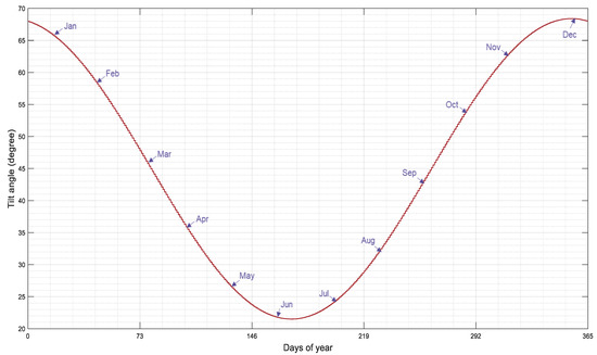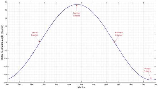 The solar declination angle (Equation (4)) is the angle formed by the sun’s beams and the Earth’s equator [37]. The solar declination angle varies with time; it is not a fixed quantity. Every single day will be unique. However, the angle is limited to 23.44° and 23.44°.