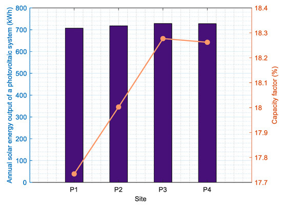 To determine the annual energy production, the average solar radiation for the year 2021 was used, which has a value of 700 kWh. The PV used for this study was JRH 540 W, with a panel area of 2.584 m2 and a maximum power of 540 W (Table 3) with an adjustable tilt angle. Figure 7 shows that sites P3 and P4 have almost identical values for the annual energy production of 728 W/m2, the difference between them being almost imperceptible. The lowest value is recorded in location P1 with approximately 700 W/m2. The capacity factor for the year 2021 is around 18.2%; the lowest value is also recorded for the P1 site at only 17.7%.