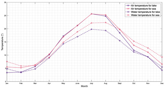 Figure 9 and Figure 10 show the average minimum and maximum temperatures for our locations. According to the graph, the average maximum temperature in summer is 25.7 °C, while the average minimum temperature in winter is around 7.5 °C for lake locations and 4 °C for sea locations. Figure 10 shows that the water temperature is more constant than the air temperature, so in winter the water temperature is higher than the air temperature, and in summer the opposite, because water heats up and cools down slower.