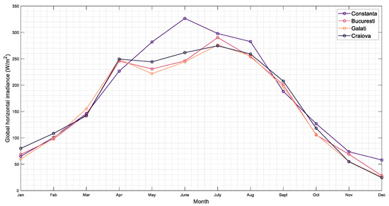 Figure 11 shows the GHI for four locations in Romania, all in areas where solar radiation is considered to have the highest values. The Constanta site is relevant in this case because it is located near the four locations used for this study. Since no measuring devices are installed in these locations, we used the in situ measurements in Constanta to further compare the results obtained to determine if they are relevant or not. As can be seen in Figure 12 and Figure 3, the differences between the measured data and those from the database are relatively small. In this case, the root mean square error (RMSE) has a value of 32.29 for P1, 30.06 for P2, 27.73 for P3, and 27.58 for P4. In this case, the data obtained from the ERA5 database underestimates the real values of solar radiation. Additionally, in Figure 11, the other three locations were chosen to make a small comparison between the solar resources; all these locations exploit the soil resources, especially the areas in the vicinity of Bucharest, but we can see that the best resources are still in Constanta where the study in question is carried out.