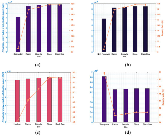 The only farm that generates more energy at its original site is the one in India, as shown in Figure 12, because the solar radiation there is substantially greater than in the areas we selected for the research. Projects, such as those in Figure 12, may provide for around 280, 2425, 15,650, or 38,510 homes, given that the average household usage in Romania is roughly 283 , or 3396 . Even if the project with the lowest capacity (729 kW) may be regarded as weak, we can state that in this situation it may be useful. A project like this could be sufficient for the first three locations that are on the lake since they could supply the communities nearby that are not developed and where the population is declining.