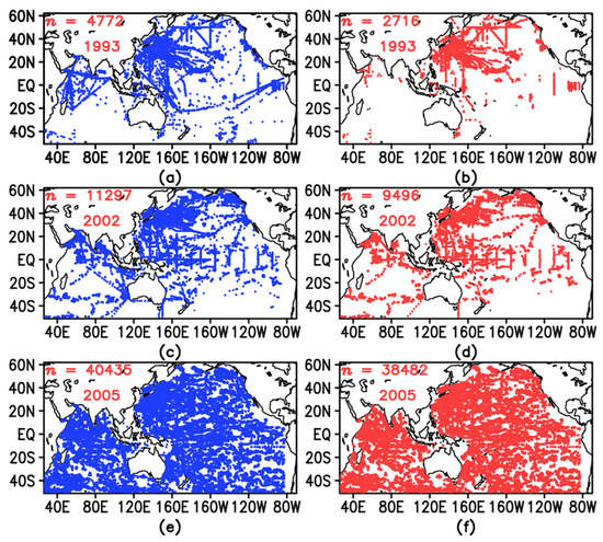 The distribution of the in situ temperature (a,c,e) and salinity (b,d,f) observations in different years. (a,b) 1993, (c,d) 2002, (e,f) 2005. The n in each figure denotes the number of the profile observations.