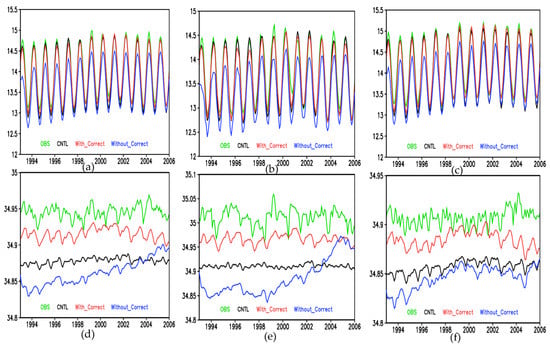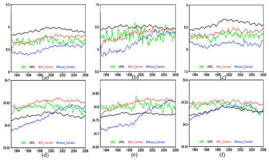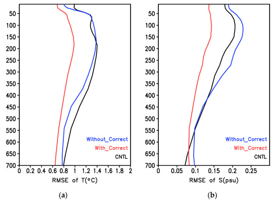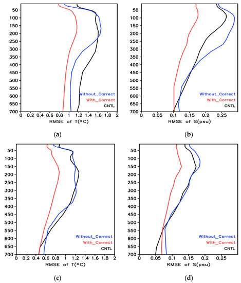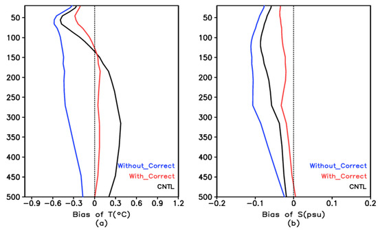 It is natural that the assimilation may improve the modeled sea surface state due to the assimilation of satellite data with global coverage. Whether or not the subsurface temperature and salinity is improved is investigated in this section. The independent temperature and salinity objective analysis data from EN4.2.2 are used to validate the impacts of the bias correction in assimilation on the subsurface temperature and salinity. EN4.2.2 ingested data from all types of ocean profiling instruments that provide temperature and salinity information, and covered the period 1900 to present. Moreover, EN4.2.2 data were subjected to a series of quality control checks and bias adjustments. The objective analysis was calculated from the quality-controlled data using the Analysis Correction scheme [47]. Therefore, EN4.2.2 is very suitable for validation of temperature and salinity in this paper.
