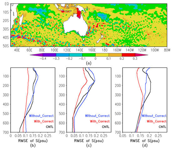 The vertical distribution of the RMSEs of temperature and salinity is different in different ocean basins (Figure 5). The experiment With_Correct exhibits the best performance for temperature and salinity in the two ocean basins. For salinity, Without_Correct performs worst in the two ocean basins with a salinity deterioration. Notably, Without_Correct yields the largest RMSEs in the Southern Indian Ocean, especially in the upper 400 m, which contributes considerably to the total RMSEs in the Southern Ocean. For temperature, Without_Correct produces an improvement in the sea surface, and a slight decline in the thermocline in the two ocean basins. Additionally, it presents a great improvement below the thermocline in the Southern Indian Ocean. This result is likely associated with the large modeled RMSEs. It is clear that the modeled RMSEs in the Southern Indian Ocean are larger than those in the Southern Pacific Ocean. The greater the model error is, the greater the adjustment induced by the assimilation is. In the southern Pacific Ocean, the salinity for both Without_Correct and With_Correct is degraded between 550 and 700 m, compared with CTNL. It is possibly associated with eddies. Abundant eddies are present (Figure 6a) in the southern Pacific Ocean. Most eddies are concentrated in the southern Pacific west of 150° W. Therefore, we divide the Southern Pacific Ocean into east and west parts by the 150° W line. The RMSEs of salinity from Without_Correct and With_Correct are larger than those of CNTL between 550 and 700 m in the two parts (Figure 6b,c). However, they are more remarkable to the west of 150° W, and contribute greatly to the total RMSEs in the Southern Pacific Ocean between 550 and 700 m. As shown by Figure 6a, plentiful eddies are also observed in the Southern Indian Ocean. We also validate the negative impact of the two assimilation experiments on the salinity in the subsurface (Figure 6d). However, the salinity between 550 and 700 m in the Southern Indian Ocean appears different from that in the Southern Pacific Ocean (Figure 5). It is possibly associated with larger adjustment to the background in the Indian Ocean (Figure 5). Those large correct adjustments compensate for the negative effects by eddies in the Southern Indian Ocean, while the small adjustments in the Southern Pacific Ocean do not offset the bad effects. The model has a coarse resolution that is not capable of resolving meso-scale eddies, while the observations include eddies. The resultant ensemble used to estimate the background error covariance does not represent the correlation well in the regions with eddies. And thus, the assimilation leads to the slight decline of salinity in the 550 and 700 m.