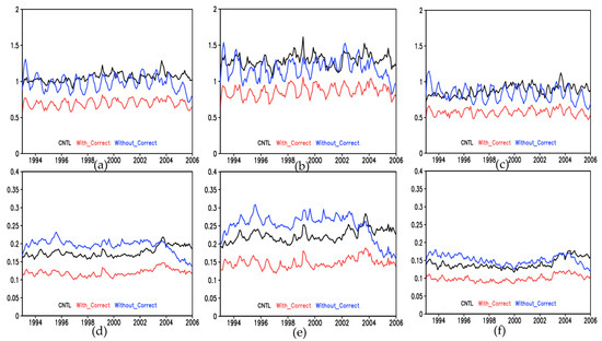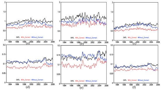 The RMSEs of both HC300–700 and SC300–700 from different experiments in different ocean basins (Figure 10) are smaller compared with those in the upper 300 m due to small changes in the subsurface. The larger RMSEs in the upper 300 m are induced primarily by the thermocline. For HC300–700 and SC300–700, With_Correct produces the smallest RMSEs and performs best. It is noticeable that Without_Correct produces a reduced RMSE of HC300–700, and a slightly increased RMSE of SC300–700 before 2003 compared with CNTL. After that, the RMSEs are reduced. Similar results are presented in different ocean basins. The RMSEs in 300–700 m are still larger in the Southern Indian Ocean than those in the Southern Pacific Ocean. Moreover, the magnitude of the reduction in RMSE is also larger compared with that in the Southern Pacific Ocean. As a result, the RMSEs in the Southern Indian Ocean contribute greatly to those in the Southern Ocean.
