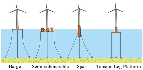 The semi-submersible, column (spar), barge, and tension-leg platform (TLP) are four types of floating offshore wind turbine foundations [43]. The schematic diagram of floating offshore wind turbines is shown in Figure 5. The semi-submersible platform is suitable for water depths greater than 50 m; it consists of anchor chains, columns, diagonal braces, crossbeams, and anchor bases. The stability of the structure and the restoring moment to keep the turbine stable are maintained by buoyancy. Spar platforms consist of ballast tanks, floating column structures, anchor chains, etc. The ballast tanks are filled with ballast water and gravel or concrete to keep the center of gravity of the structure below the floating center, and because of the greater draft, the structure has less vertical wave excitation and therefore less heave motion but has more pitch and roll motion [44,45]. Barge platforms are suitable for installation in the calm sea, similar to a ship, with a large structure, uniform buoyancy distribution, good stability, and small applicable water depth requirements. The stability of the platform depends on the mooring system and the adjustment of the waterline position [46]. TLPs consist of semi-submersible structures, floating tanks, and anchor chains (tension legs); the stability of the platform is provided by the tension of the tension legs. TLPs are lighter in mass, smaller in size and less costly, but the damage rate of the tension leg is high, so high maintenance costs are a challenge for TLPs currently [47,48].