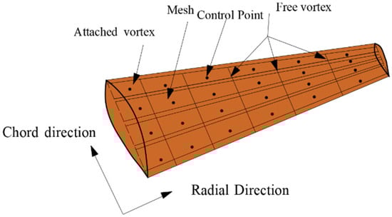 The blade is divided into several vortex lattices in radial and chordal directions using the discrete vortex distribution lift force surface model, also known as the vortex lattice method (VLM); the ring volume varies along both radial and chordal directions, which better describes the three-dimensional flow on the blade surface [94]. Figure 7 illustrates how the blade is griddled using the vortex lattice approach, with M vortex lattices in the chordal direction and N vortex lattices in the radial direction. The control point is positioned in the middle of the vortex lattice. The vortex line along the radial direction is the attached vortex, and the vortex line in the chord direction is the free vortex. Each vortex lattice contains four vortex lines with the same circulation value, and the right-hand rule and the vortex lattice normal vector direction are used to calculate the direction of the vortex lattice circulation.