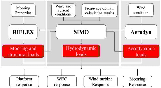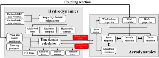 CWWHDs are subjected to aerodynamic loads, wave loads, and mooring loads simultaneously during operation [59]. Fully coupled numerical simulations of CWWHDs are divided into three modules based on the characteristics of the motion and the structure: a hydrodynamic calculation module, a structural dynamics calculation module, and an aerodynamic calculation module. The computational theory involved in each computational module of the wind-wave coupled simulation is shown in Table 2.