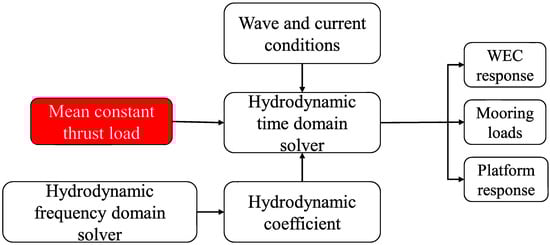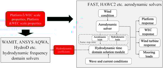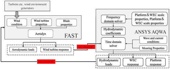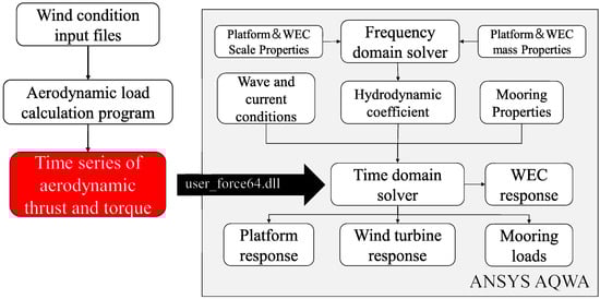 At present, in the simulation method of the wind-wave coupling effect, to focus on the hydrodynamic performance of CWWHDs, the method of simplifying the aerodynamic load to constant thrust and torque is widely used, which improves the computational efficiency but reduces the numerical calculation accuracy to study specific problems [21,22]. The partially coupled simulation method uses an aerodynamic simulation program to obtain a time series of wind velocities and computes them in parallel as input values to the hydrodynamic simulation program. This simulation method takes into account the time-varying nature of the wind but ignores the effects of hydrodynamic loads and device motion on the aerodynamic loads [23,24,25,26]. Fully coupled simulation can ensure high computational accuracy, synchronize the simulation of aerodynamic and hydrodynamic loads, and perform wind-wave coupling and multi-body coupling calculations within each computational step [27,28,29,30]. However, there is no mature integrated wind-wave coupling simulation program, and most of them are based on aerodynamic and hydrodynamic simulation programs for combined simulation or self-developed coupling simulation programs to complete the simulation requirements.