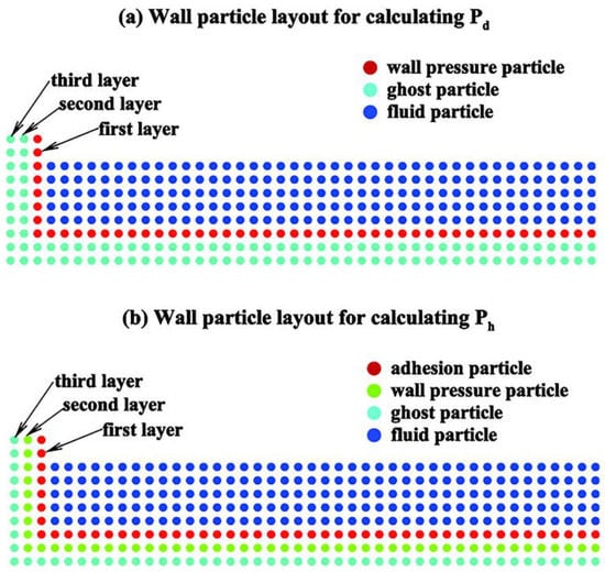 Two different wall particle layouts are used to calculate the hydrostatic pressure and dynamic pressure, respectively. The three-layer particle layout shown in Figure 2a is adopted to calculate the dynamic pressure . This layout is identical to that of the original MPS method. In this layout, wall pressure particles are settled in the first layer and ghost particles are settled in the other layers in order to ensure accurate particle number density near the wall. The other three-layer particle layout, shown in Figure 2b, is adopted to calculate the hydrodynamic pressure . In Figure 2b, two pressure particle layers and a ghost particle layer are involved. The particles in the first layer are treated as adhesion fluid particles. Therefore, they satisfy the Laplacian equation. The particles in the second layer, meanwhile, are wall boundary particles, which satisfy the wall boundary condition in Equation (23).