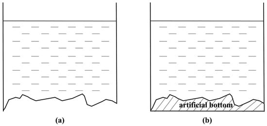 Diagrammatic sketch of the artificial bottom of an irregular wall. (a) The computational domain is irregular before the artificial bottom is introduced. (b) The irregular computational domain becomes regular after introducing the artificial bottom.