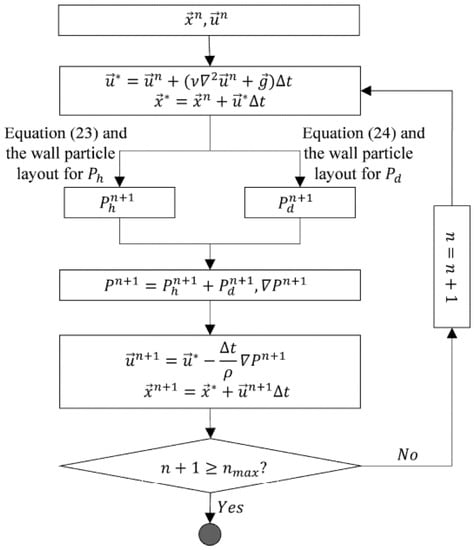 The simulation process of the original MPS scheme is shown in Figure 1. As is shown in the figure, the original MPS method directly solves the pressure Poisson equation to obtain the total pressure of fluid flow.