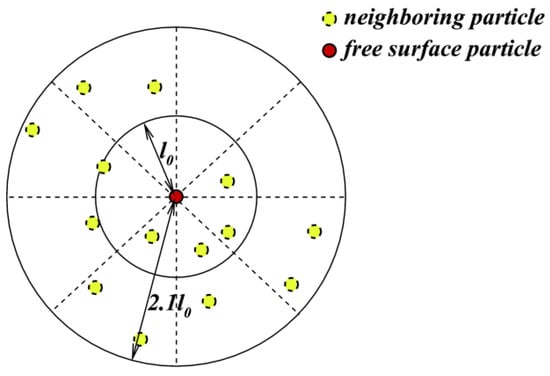 For a particle that requires a secondary judgement, its neighboring region between and is divided into eight parts (as Figure 5 shows). If there are no neighboring particles in the two adjacent parts, then the particle is recognized as a free surface particle.