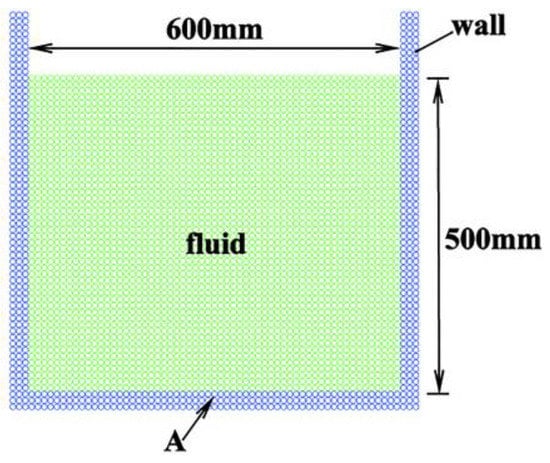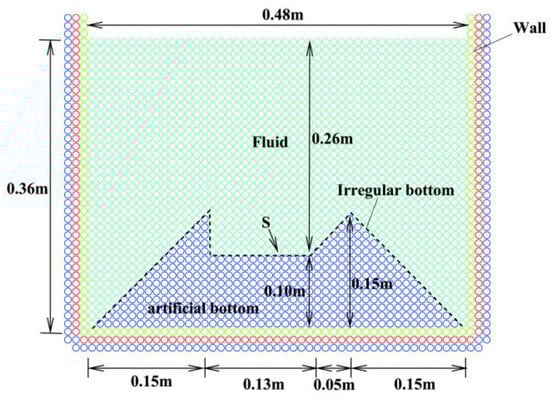 Figure 9 shows the simulation domain of the hydrostatic calculation in a tank with an irregular bottom. The width of the tank was 0.48 m, and the maximum fluid depth was 0.36 m. The particle spatial resolution , and the time step length . The monitoring point S was set to observe the pressure variation. Point S was located at the middle of the bottom, and the depth was 0.26 m away from the free surface. As is shown in Figure 9, the irregular computational domain became regular after the artificial bottom was introduced.