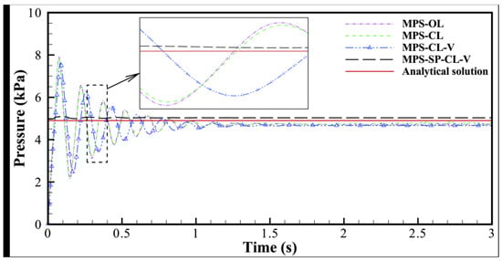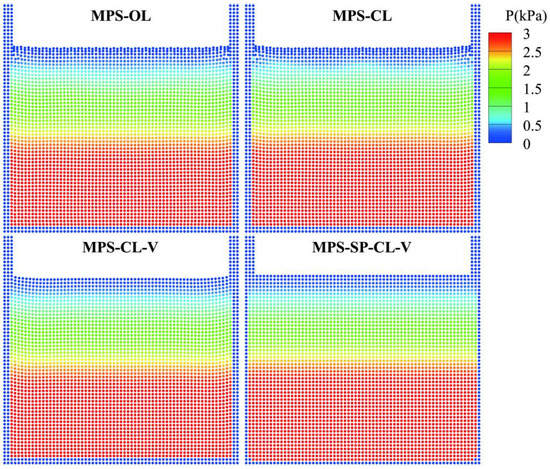 Hydrostatic, dam-breaking, and sloshing examples were applied to verify these techniques. The original MPS method and the four models listed in Table 1 (including MPS-OL, MPS-CL, MPS-CL-V, and MPS-SP-CL-V) were involved in the verification. By discussing and comparing the simulation results of these methods, we drew the following conclusions: