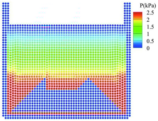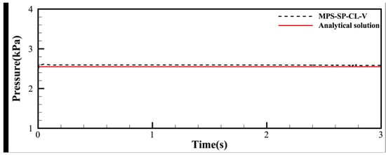 Figure 10 shows the fluid behavior of the hydrostatic simulation in a tank with an irregular bottom using the MPS-SP-CL-V model at t = 3.0 s. It is clear from the figure that the free surface remained flat and the fluid particles in the tank maintained a regular distribution. The pressure distribution was also smooth. Figure 11 shows the time history of the hydrostatic pressure on point S. It is clear that the curve of the MPS-SP-CL-V model was almost consistent with that of the analytical solution. In general, both Figure 10 and Figure 11 indicate that the MPS-SP-CL-V model also reproduced the hydrostatic pressure well when simulating a case with an irregular bottom.
